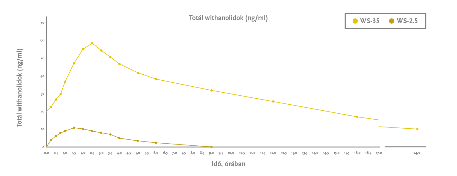 Az alábbi ábrán a Shoden® HPLC-kromatogramja látható két módszerrel mérve (Mindegyik csúcs másik fajta hatóanyagot jelent. És bár meg nem oszthatjuk, de elmondhatjuk, hogy a KSM-66® HPLC-kromatogramján alig volt pár csúcs, míg a Sensoril®-én is lényegesen kevesebb, mint amit itt látunk a Shoden® kromatogramján).Az alábbi grafikon egy 2023-ban publikált biohasznosulási vizsgálatból van (11), és rajta az  ashwagandha fő hatóanyagai, a withanolidok vérszintjének emelkedése látható. A sárga görbe a Shoden® bevétele utáni vérszintet mutatja, míg a barna görbe egy hagyományos ashwagandha-kivonat utáni vérszintet. Az elfogyasztott hatóanyag (withanolidok) mennyisége azonos volt a két kivonat hatóanyagkoncentrációjától függetlenül (tehát az alacsonyabb hatóanyagkoncentrációjú, hagyományos kivonatból több lett elfogyasztva). Látható, hogy mennyivel magasabb vérszintet ért el a Shoden®, és mennyivel tovább maradt magasan a szintje: még 24 óra után is jelentős szint volt, míg a másik esetben már 8-9 óra után detektálási limit alá esett. (És bár meg nem oszthatjuk, de elmondhatjuk, hogy a KSM-66® azonosan teljesített, mint a hagyományos ashwagandha-kivonat, azaz megegyezett a görbéje a sárga görbével, míg a Sensoril® kb. 2x magasabb withanolid-vérszintet okozott, azaz kb. 2x jobb volt a biohasznosulása, mint a KSM-66®-nak, de töredékét érte csak el a Shoden®-ének).Ez pedig alább egy 2021-ben publikált biohasznosulási vizsgálat (13), ahol a KSM-66®-ot hasonlították össze egy Prolanza nevű, elnyújott felszívódású ashwagandha-kivonatot tartalmazó készítménnyel (a KSM-66® volt a referenciagörbe itt, azaz a kisebbik, zöld görbe, míg a Prolanza a tesztkészítmény görbéje, a nagyobbik, sárga görbe):Ahhoz, hogy értelmezni tudja az olvasó a két utóbbi (biohasznosulást mérő) ábrát, fontos tudni, hogy a KSM-66®-ot a Prolanza-val összehasonlító vizsgálatban 30mg withanolidokat tartalmazó mennyiséget fogyaszttattak el a résztvevőkkel, míg a Shoden®-t a hagyományos kivonattal összehasonlító vizsgálatban 180mg withanolidokat tartalmazó mennyiségeket, azaz 6x annyit. A biohasznosulást az ún. AUC értékkel fejezik ki (Area Under Curve), azaz a görbe alatti területtel. Ez mutatja, hogy mennyi hatóanyag szívódott fel (mennyivel és mennyi időn át növekedett a hatóanyag szintje a vérben).