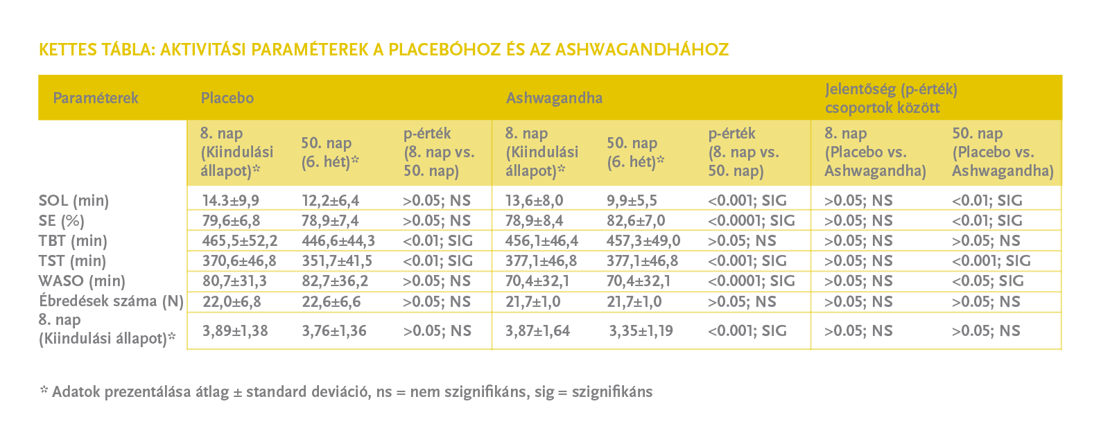 Az objektív eredmények (aktigráfiás műszeres alvásmérések) szerint pedig nőtt az alváshatékonyság (alvásminőség), az alvásban töltött idő, csökkent az elalvási idő és az alvás közbeni ébrenlétek mennyisége. Ezek a placebocsoportban nem javultak.