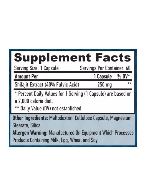 Minden shilajit kapszula 250 mg standardizált kivonatot tartalmaz, amely 40% fulvosavat biztosít, amely támogatja a sejtek energiatermelését és a jó közérzetet.