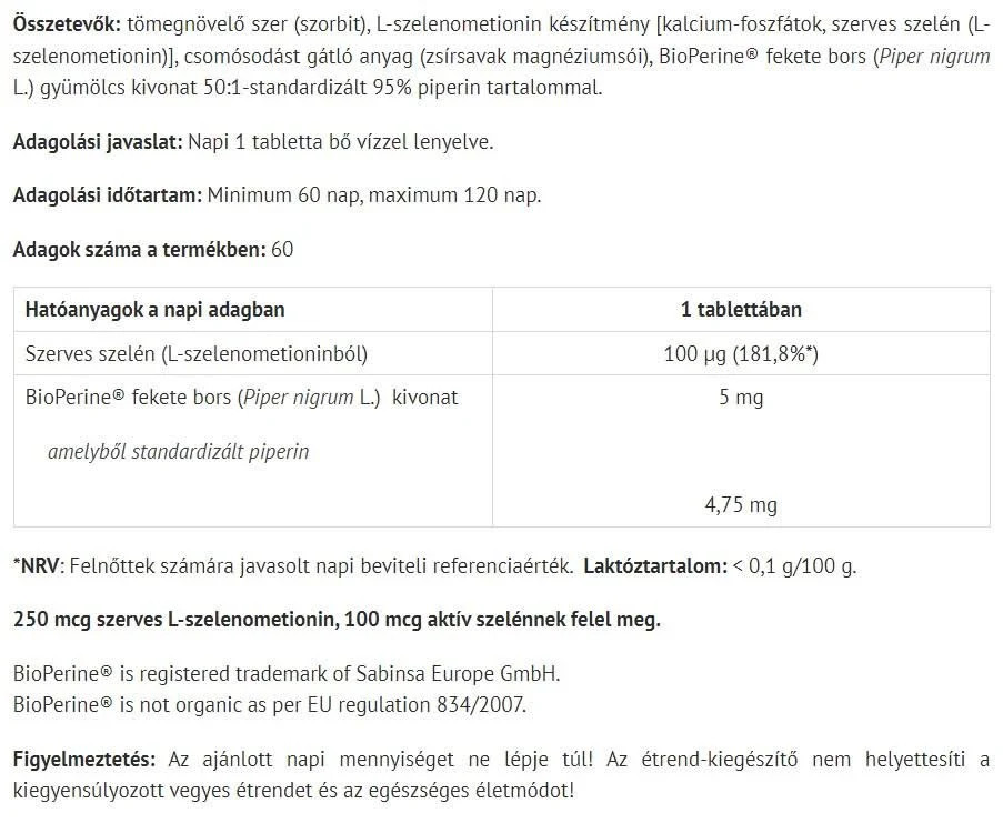 Összetevők: tömegnövelő szer (szorbit), L-szelenometionin készítmény [kalcium-foszfátok, szerves szelén (L-szelenometionin)], csomósodást gátló anyag (zsírsavak magnéziumsói), BioPerine® fekete bors (Piper nigrum L.) gyümölcs kivonat 50:1-standardizált 95% piperin tartalommal.