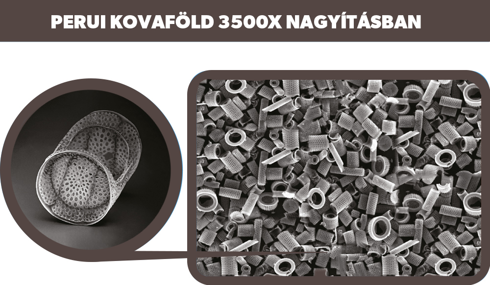 Tisztító és méregtelenítő hatékonysága miatt kiemelkedő termék a piacon. Megtisztítja a beleket, az ereket, a nyirokkeringést és a bőrt. A Perui kovaföld nem csodaszer! Az emberi szervezet a csoda, mely képes megújulni, ha tisztán, rendeltetésszerűen működik. Mindemellett koncentrált mennyiségben tartalmazza szervezetünk egyik fontos tápanyagát, a szilícium-dioxidot. A Perui kovaföld az egyik legtisztább (94%) minőségű étkezési kovaföld. A Perui kovaföld képes hatékonyan kivezetni a baktériumokat, vírusokat és nehézfémeket a szervezetből, pusztán a szerkezetéből adódóan.
